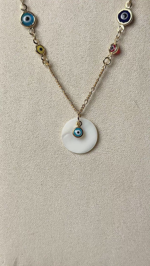 A mixture of different sizes and colors of evil eye on this beautiful 18K Gold Plated chain with a mother of Pearl and a tiny turquoise evil eye pendent.