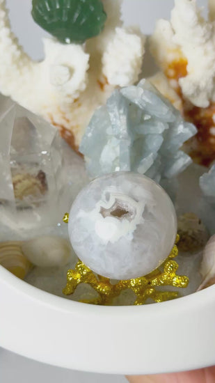 Immerse yourself in the calming energy of the ocean with this handcrafted crystal bowl, designed to evoke the serenity and magic of coastal tides. At its heart lies a calming Blue Barite from Morocco, surrounded by a soothing Blue Celestite cluster and a radiant Clear Quartz tower to amplify clarity and intention. A carved Green Aventurine shell invites prosperity and gentle heart healing, while an Agate with Quartz sphere anchors the piece in grounded balance. Natural coral and seashells, sealed with sparkly resin, dance throughout the ceramic base like treasures washed ashore. Finished with a luxe gold coral sphere holder, this bowl brings peace, flow, and emotional renewal to any altar or sacred space. A perfect offering for water signs, ocean lovers, or anyone ready to return to their inner calm.