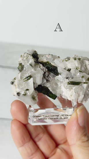 Green tourmaline on quartz forms in pegmatite environments where mineral rich fluids move through cavities and fractures in the host rock. As these fluids cool, quartz crystallizes first, creating a stable base. Under the right conditions, tourmaline crystals then grow directly onto or through the quartz, bonding the two minerals together.