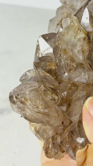 The smoky color forms when trace amounts of aluminum within the quartz are naturally irradiated over time, creating its characteristic grounding hue. These combined conditions produce a crystal that reflects both structural complexity and deep energetic density. Brazilian deposits are especially prized for producing well-defined elestial formations with strong smoky saturation.